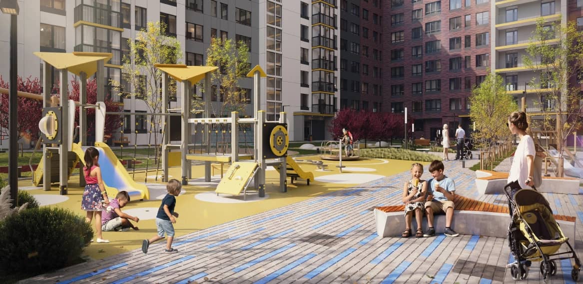 Переменная этажность позволяет солнечным лучам попадать во двор, а расположение домов делает пространство двора комфортным и безопасным.
